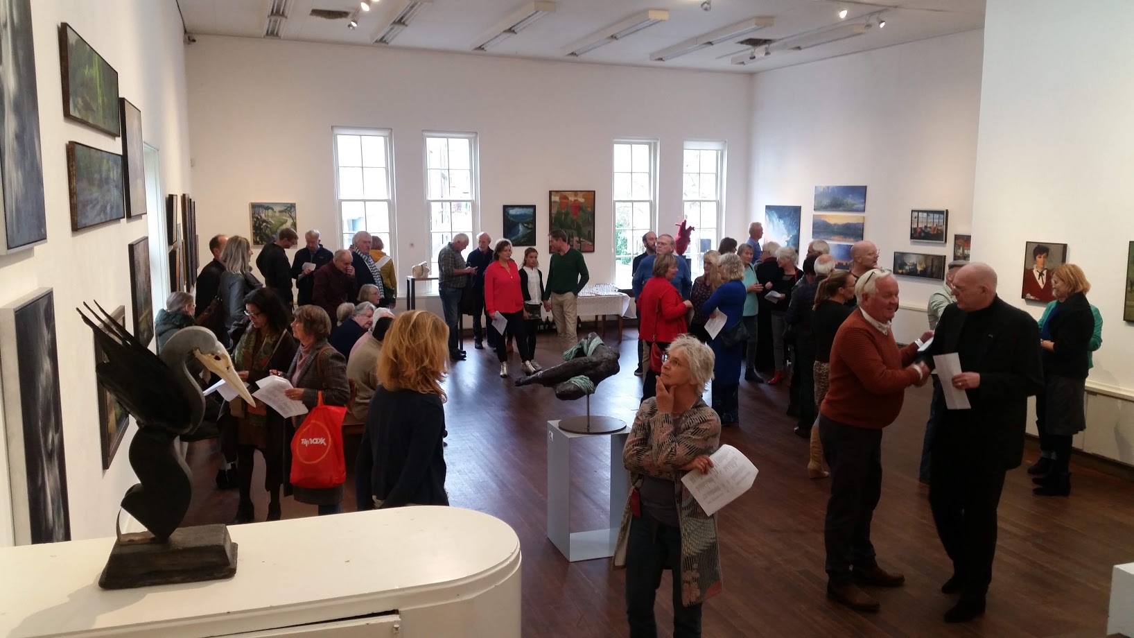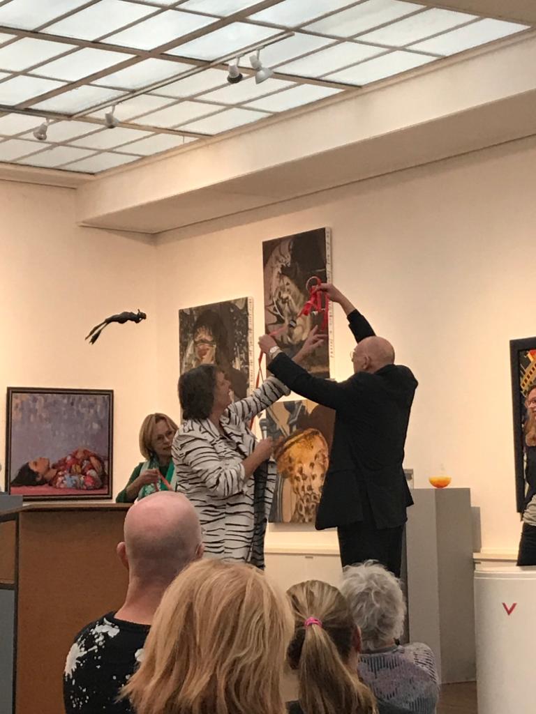 Opening van de expositie De Rode Draad van Klaas Koops en AKKA in Pictura Groningen. AKKA bedankt Klaas van harte voor de prachtige expositie. Namens alle AKKA leden krijgt Klaas een verjaardagscadeau: een rode draad met diverse verfspullen, met de wens dat hij nog lang werk mag blijven maken! De expositie loopt tot en met 1 december 2019.
