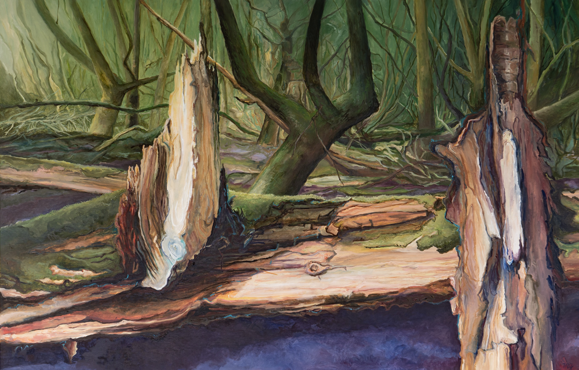In maart 2020 ben ik begonnen aan de serie Stille Getuigen II. Een zoektocht in stilte in mezelf. Mijn modellen staan in de bossen tussen Ees, Exloo en Odoorn. Eerst begon ik klein (20x30) en daarna kwamen er grotere werken (60x80) en tenslotte twee hele grote werken (270x100).